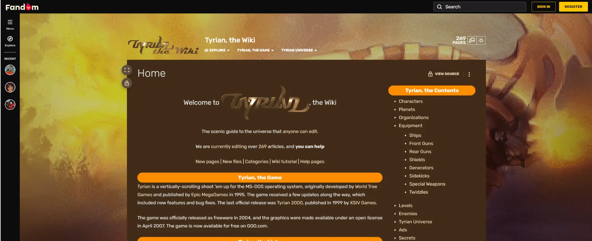 Tyrian is a vertically-scrolling shoot 'em up for the MS-DOS operating system, originally developed by World Tree Games and published by Epic MegaGames in 1995. The game received a few updates along the way, which included new features and bug fixes. The last official release was Tyrian 2000, published in 1999 by XSIV Games.