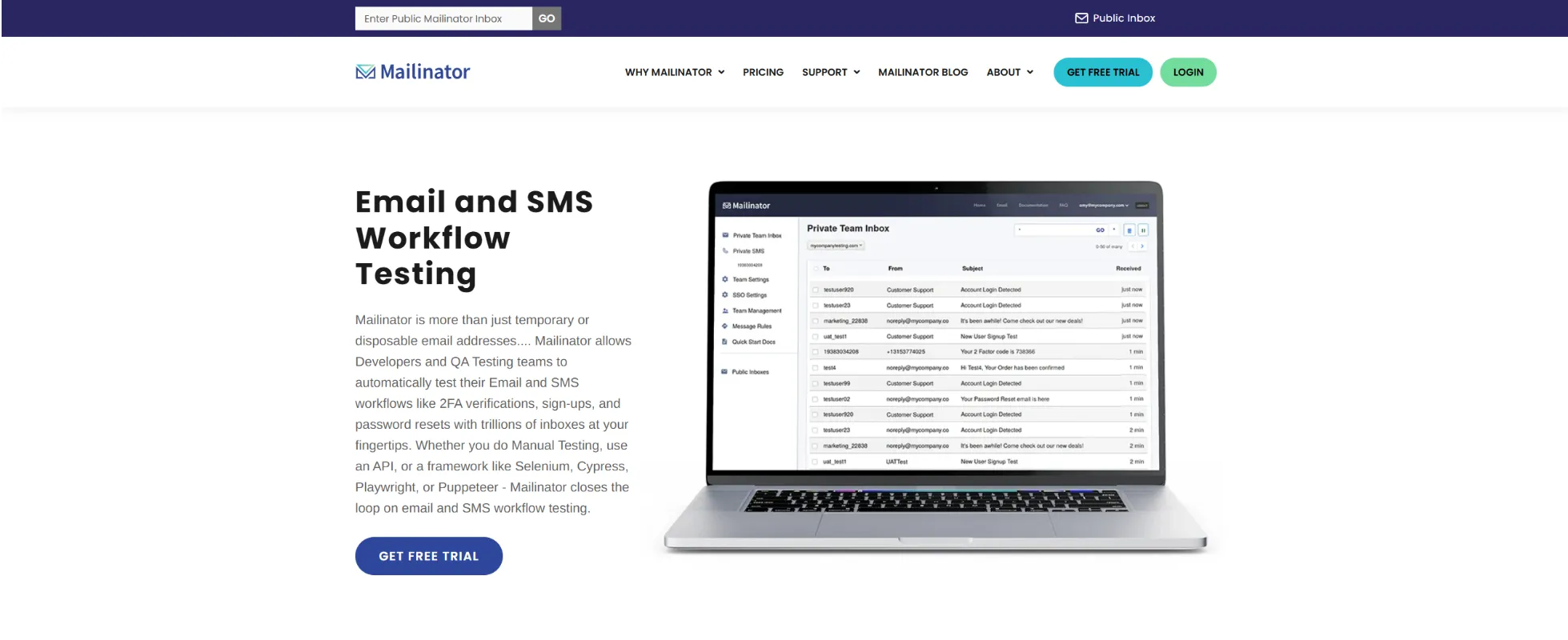 Mailinator allows Developers and QA Testing teams to automatically test their SMS and Email workflows like 2FA verifications, sign-ups, and password resets with trillions of inboxes at your fingertips. Whether you do Manual Testing, use an API, or a framework like Selenium, Cypress, Playwright, or Puppeteer - Mailinator will close the loop on email/SMS testing.